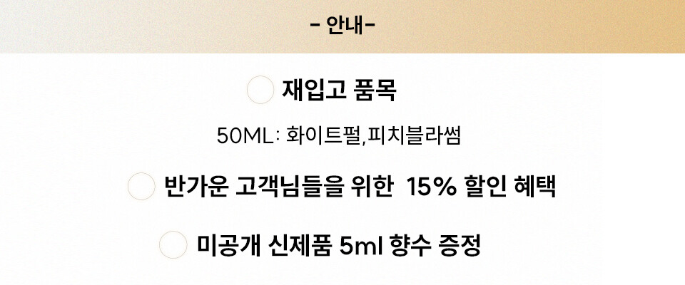 ※ 피치블라썸과 화이트펄 시향지가 입고되었으니 이용에 참고부탁드리겠습니다.